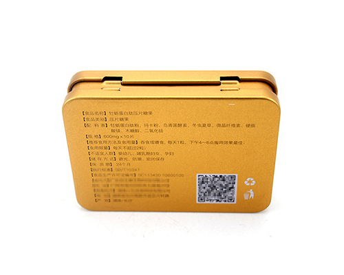 此款馬口鐵保健品鐵盒包裝為單面CMYK四色印刷處理,外過水性亮光油,內涂金油,過油目的不僅能提高鐵盒整體效果,具有強烈的金屬質感外,還對鐵盒印刷面形成一層致密的保護膜,對鐵罐刮花、防銹起到一定的防護作用。除了過光油、透明油外,客戶還可選擇過皺紋油、珠光油、爆炸油等。