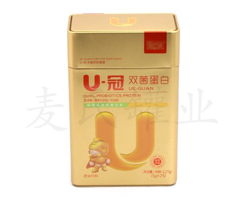 很多平蓋益生菌固體飲料鐵盒上都有臺階,臺階的功能在于方便同一尺寸的鐵盒相互重疊,這非常方便的商場貨架上堆放產品并且有效利用貨架空間。這款益生菌固體飲料鐵盒,采用國產一級馬口鐵為基材,專色印刷工藝。想了解更多嬰幼兒保健品鐵盒包裝,請致電:186-7632-2818,清遠麥氏罐業恭候您的到來!