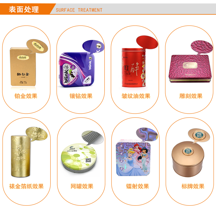 本款定制包裝鐵罐表面有膠印工藝,個性化定制不同的圖案和文字。我司還可制作出裱紙、貼鉆、鐳射等工藝效果,盡力滿足客戶多方面的制作需求。
