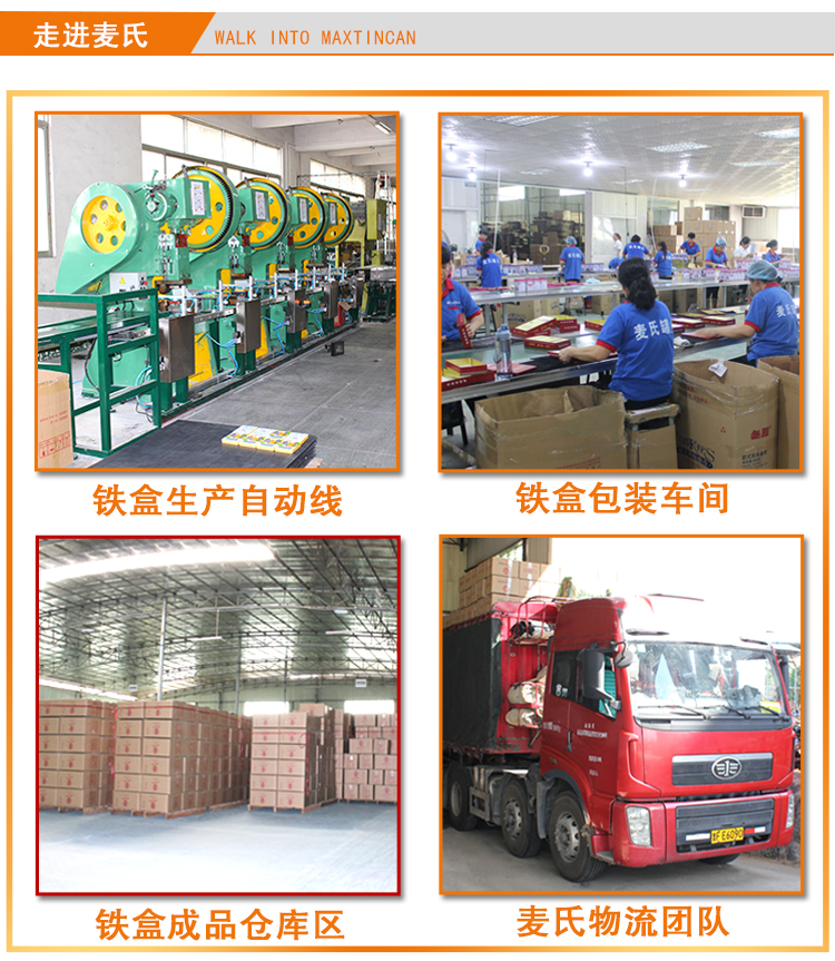 圓形食品包裝印鐵制罐廠-麥?zhǔn)瞎迾I(yè)有限公司,擁有十六年的大鐵盒包裝生產(chǎn)經(jīng)驗,我司不斷完善大鐵盒包裝檢驗體系與營銷服務(wù)體系的同時,為九芝堂、國膠堂、道地藥業(yè)、廣藥集團(tuán)、王老吉藥業(yè)、養(yǎng)尊堂、宛西制藥等國內(nèi)商家提供各種多樣、精美、實用、安全的馬口鐵盒包裝產(chǎn)品。公司擁有五百多臺制盒設(shè)備,三百多名訓(xùn)練有素的操作工,五條進(jìn)口自動化制盒線,按時完成客戶的大貨生產(chǎn)需求。
